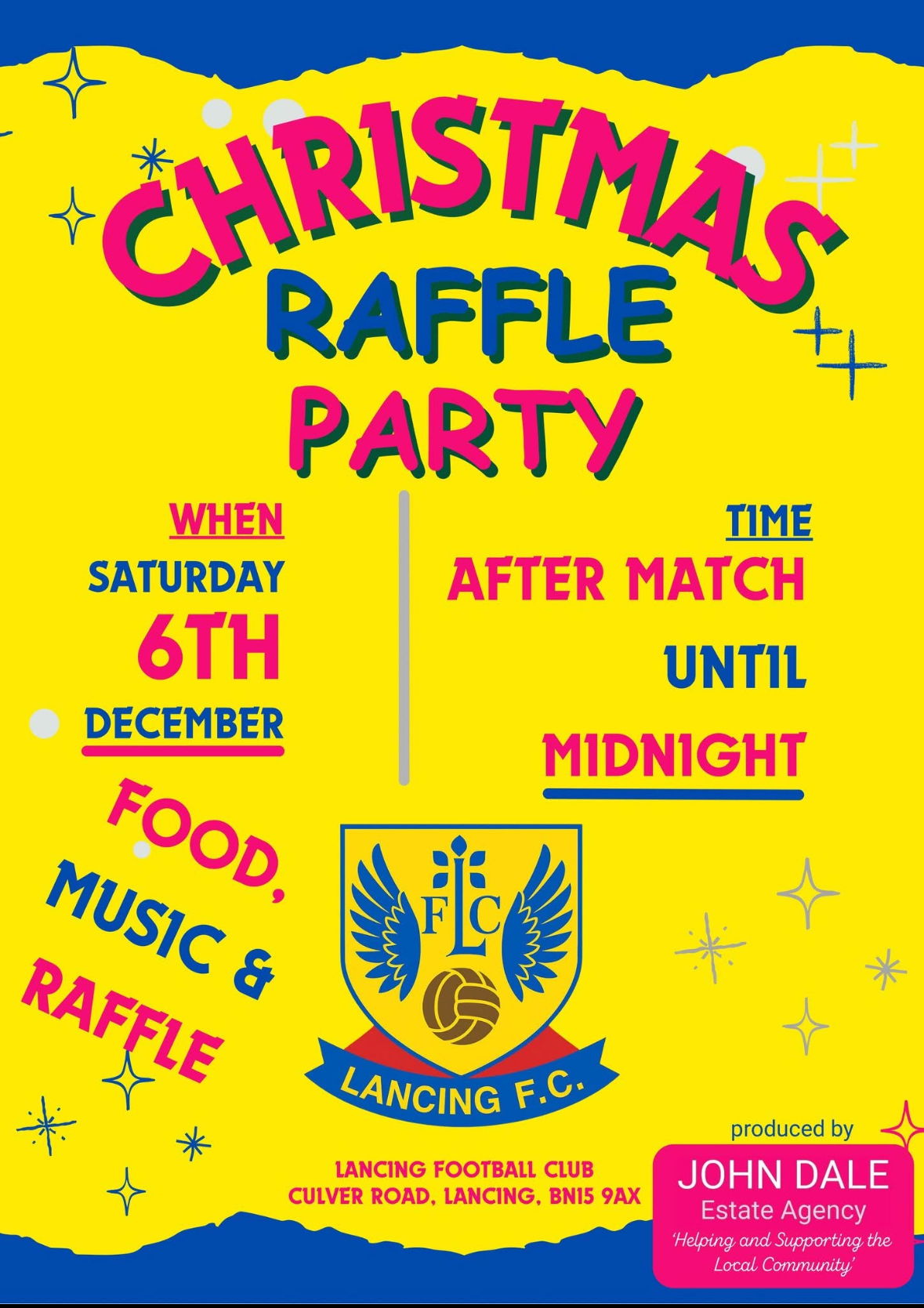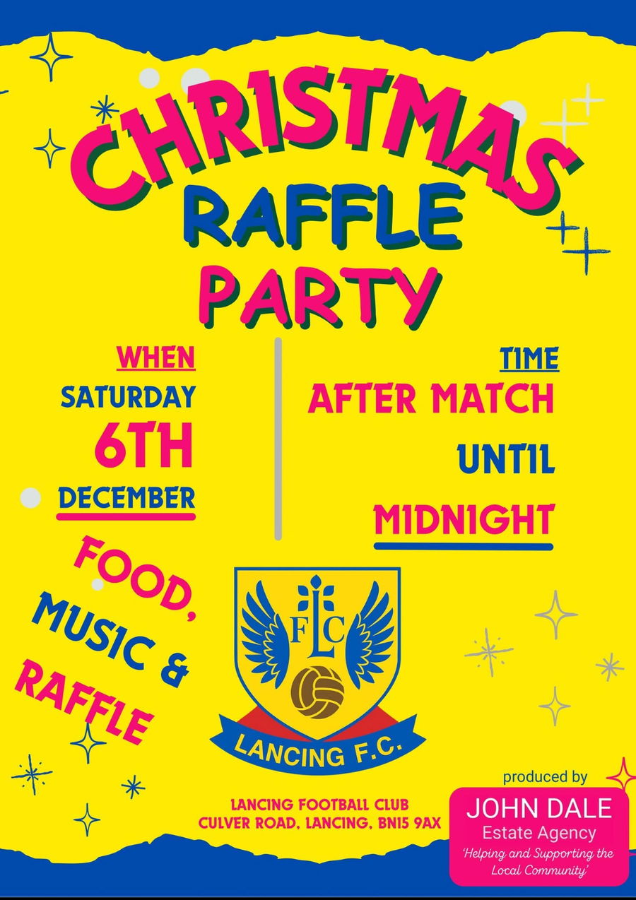 Join us on Saturday 6th December straight after our match against Seaford for our Christmas party. There will be food, music and a raffle. Raffle tickets are available to buy now.