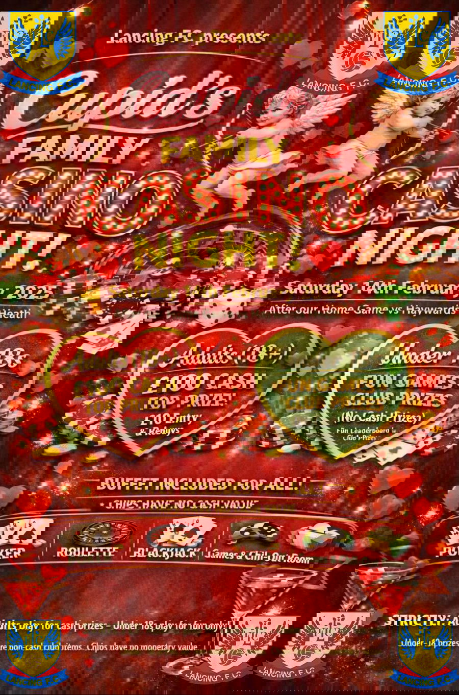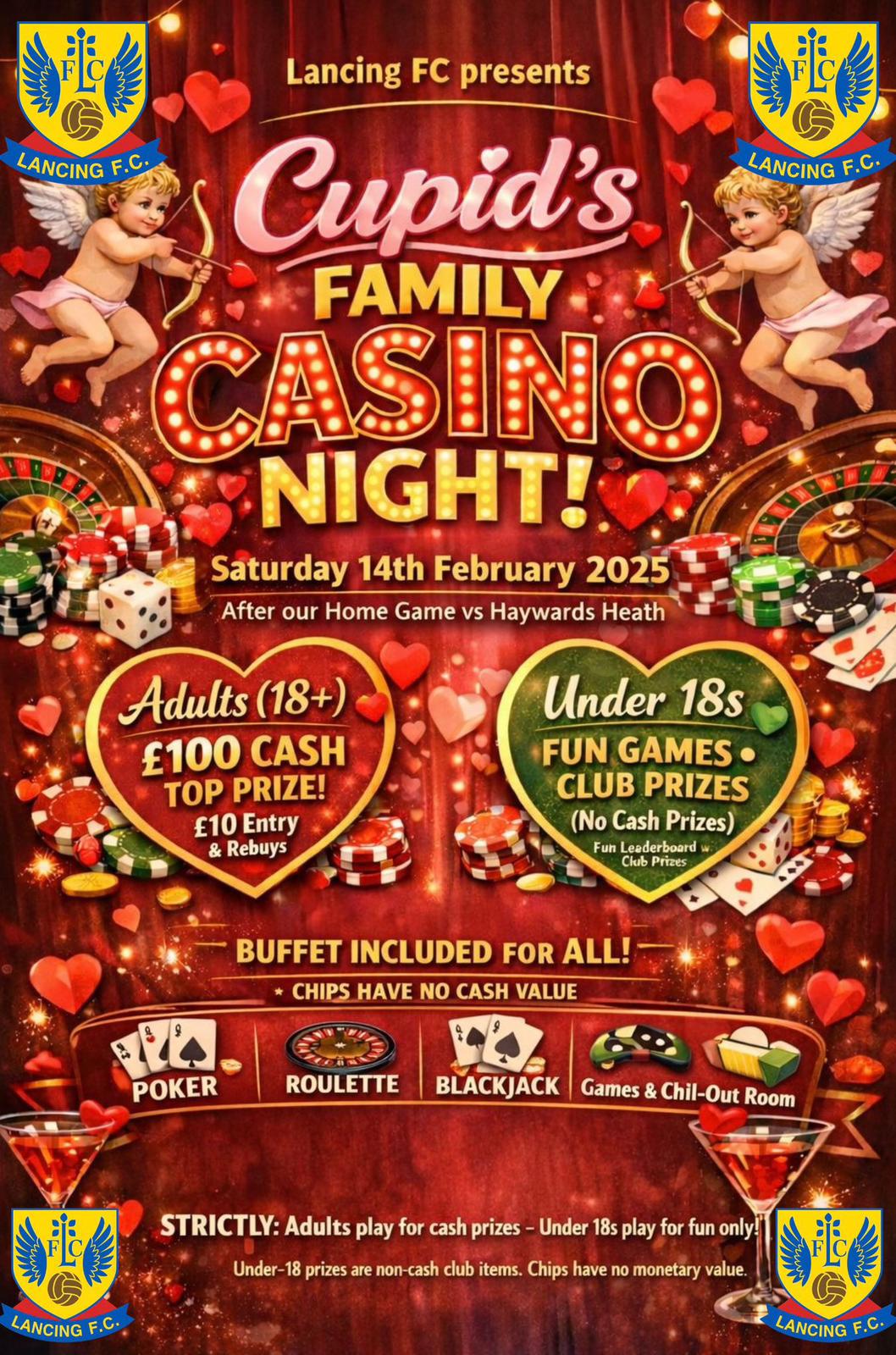Join us for a fun, social Lancing FC Casino Night, open to adults and under-18s, combining casino-style games, food, prizes and a supervised youth chill-out area.